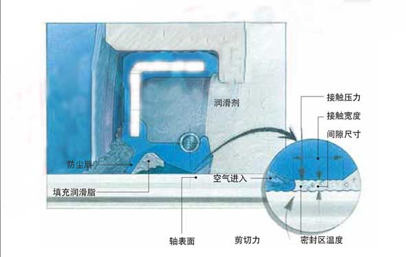 油封的密封機理涉及兩個因素,一個是腔體的密封,主要是油封外緣(靜態(tài)部件)在腔體中的定位;二是密封唇口與旋轉(zhuǎn)軸表面接觸的動態(tài)密封,這是油封的Z重要功能。附下圖:油封密封唇口與旋轉(zhuǎn)軸表面接觸區(qū)。